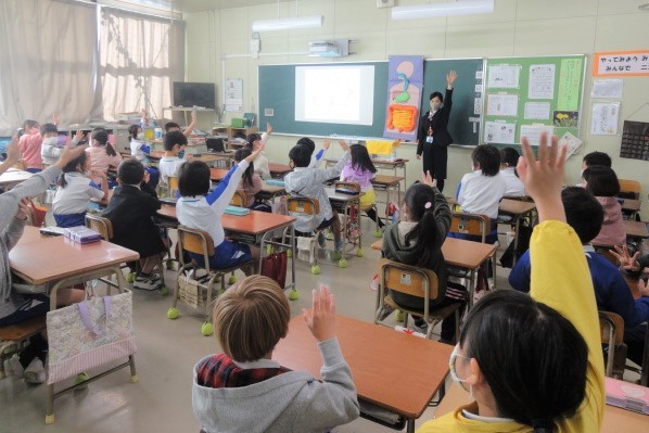 先日神戸市立なぎさ小学校の2年生の皆さんを対象に、「おなか元気教室」を開催しました。なぎさ小学校さまでは毎年出前授業をさせていただいています。そのため小学校に伺うと、いつも前年に参加してくれた皆さんから「ヤクルトさーん」と声を掛けていただけます。